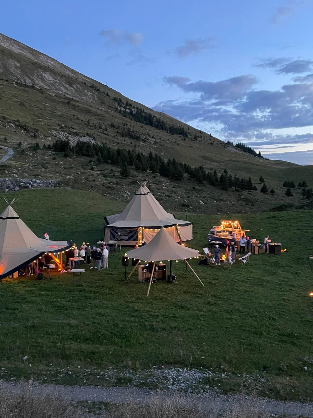 - 2 tipis connectés pour le repas, la piste de danse, bar et DJ intérieur…